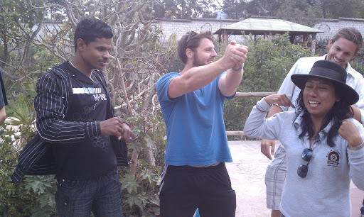 Also bizarre: When you stand on the equator line, the equal pulls of the magnetic poles actually make you weigh less… 2.3 pounds to be exact! For this reason, you have less muscle strength on the line. In these pictures, our tour guide is pulling on the resisting arms of the guys in our group, first about 3 meters from the line where the guys had no problem lifting her… and then on the line where she pulled their arms down with ease!