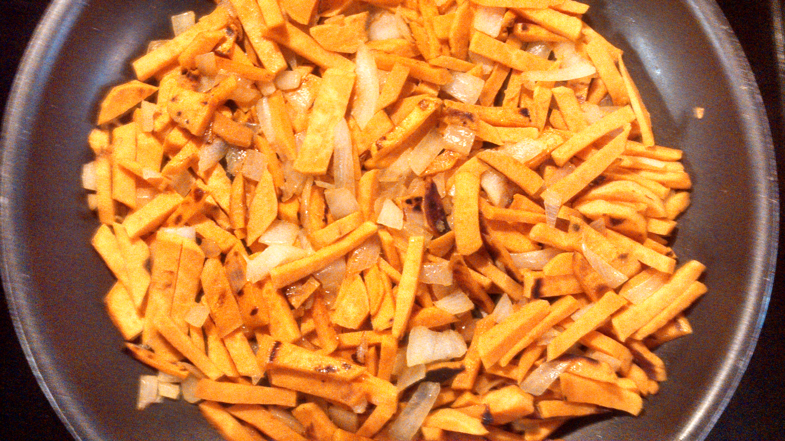 I chopped up half an onion I found in the fridge and sautéed it in extra virgin olive oil, turning the heat down to med-low before adding the sweet potatoes… (They have a tendency to burn on the outside before cooking all the way through).