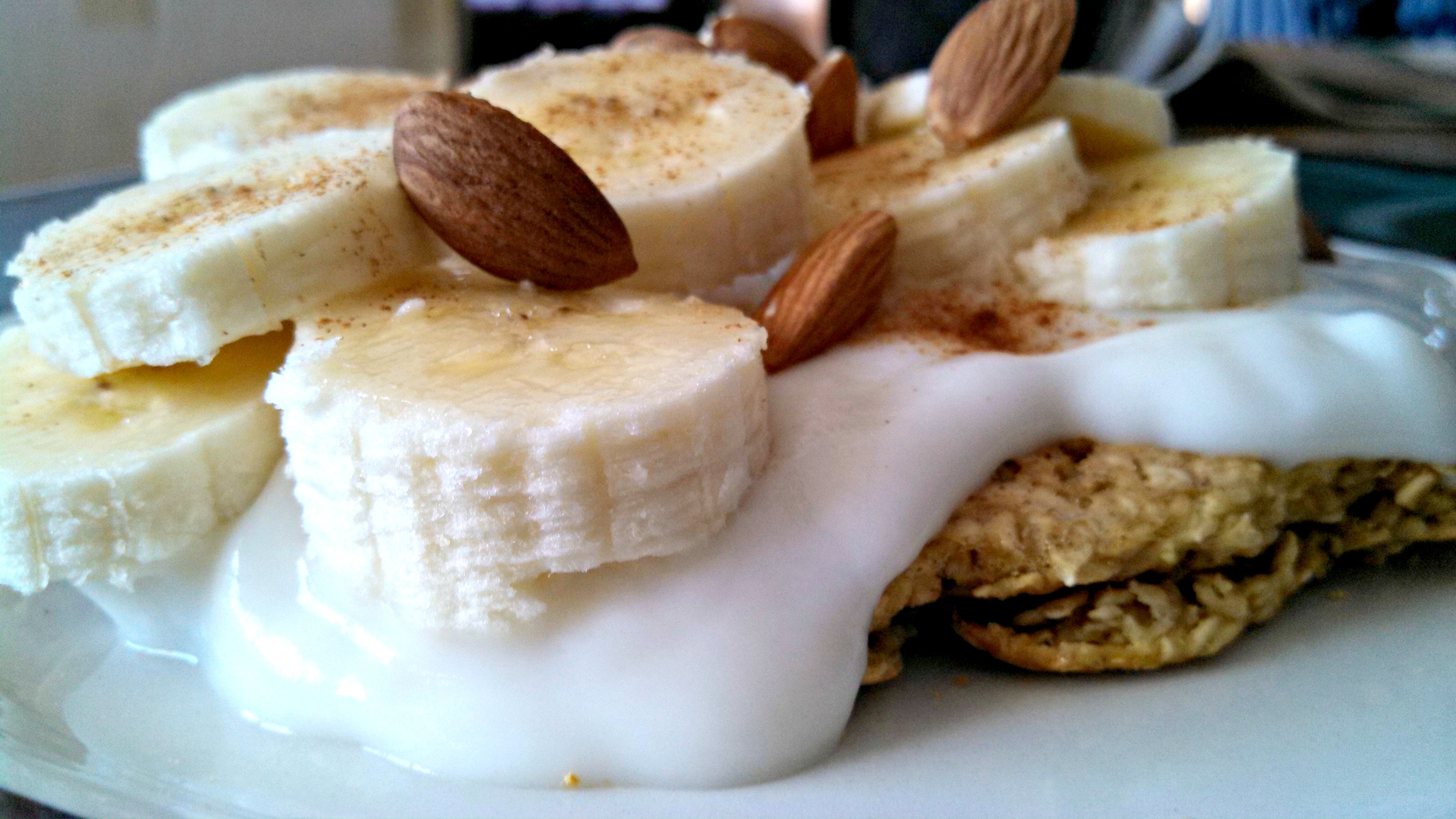 Top with 1/3 cup vanilla, low-fat yogurt, 1 sliced banana, 10 raw almonds, & cinnamon.
