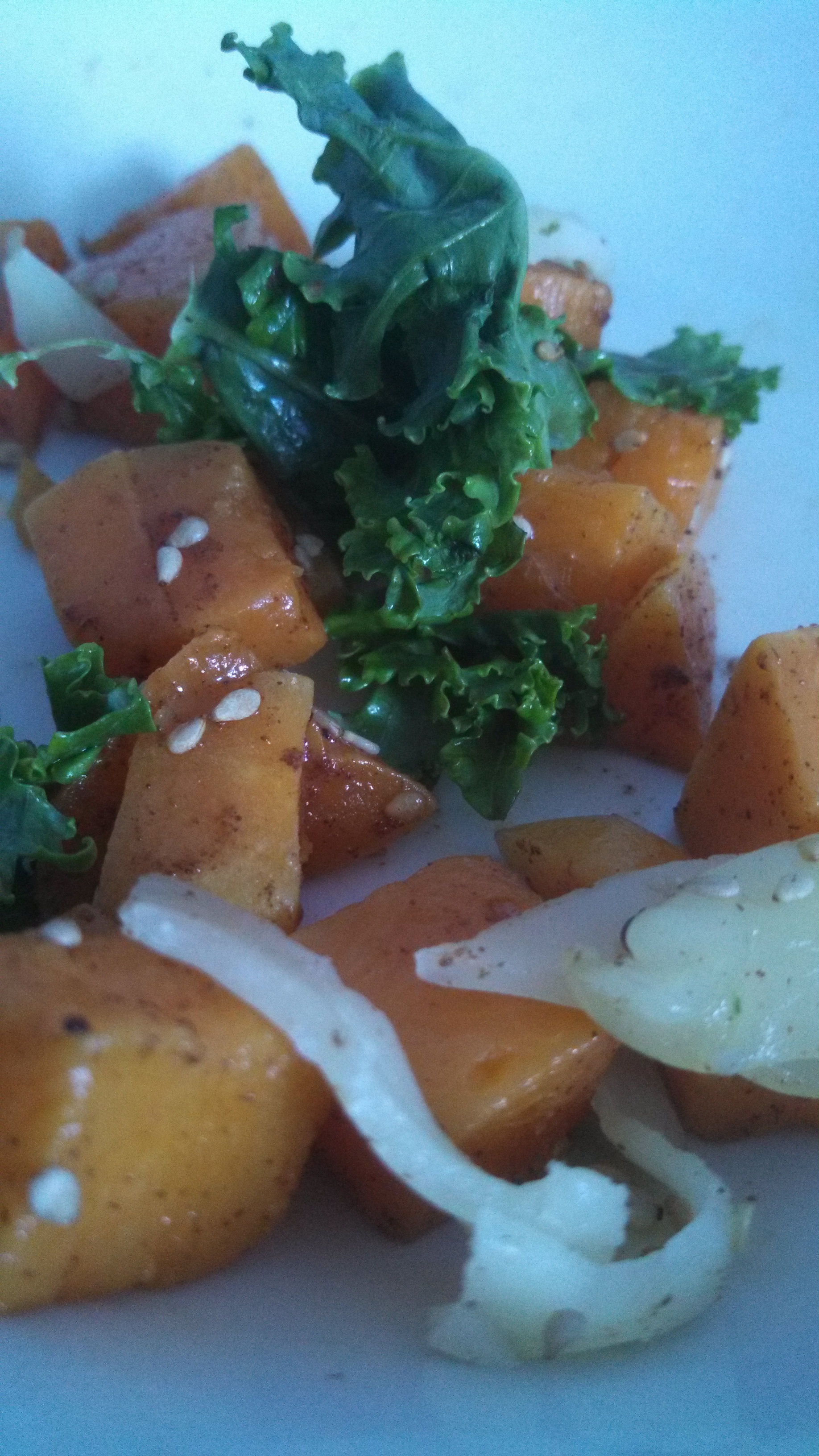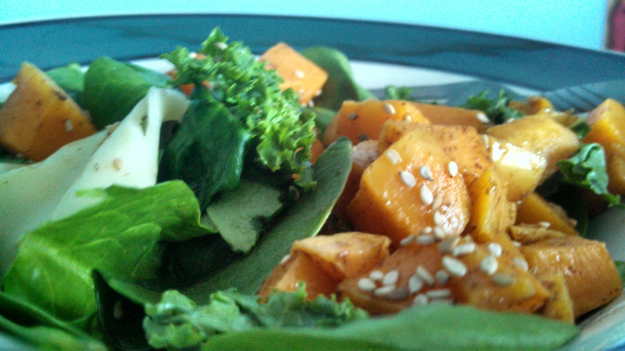 Throwing a couple handfuls of spinach and kale in a bowl, I put about 3/4 c of the squash on the side, a big ol’ slice of mozzarella on the greens, microwaved for 30 sec, then topped it off with a sprinkling of sesame seeds for texture and healthy fats.