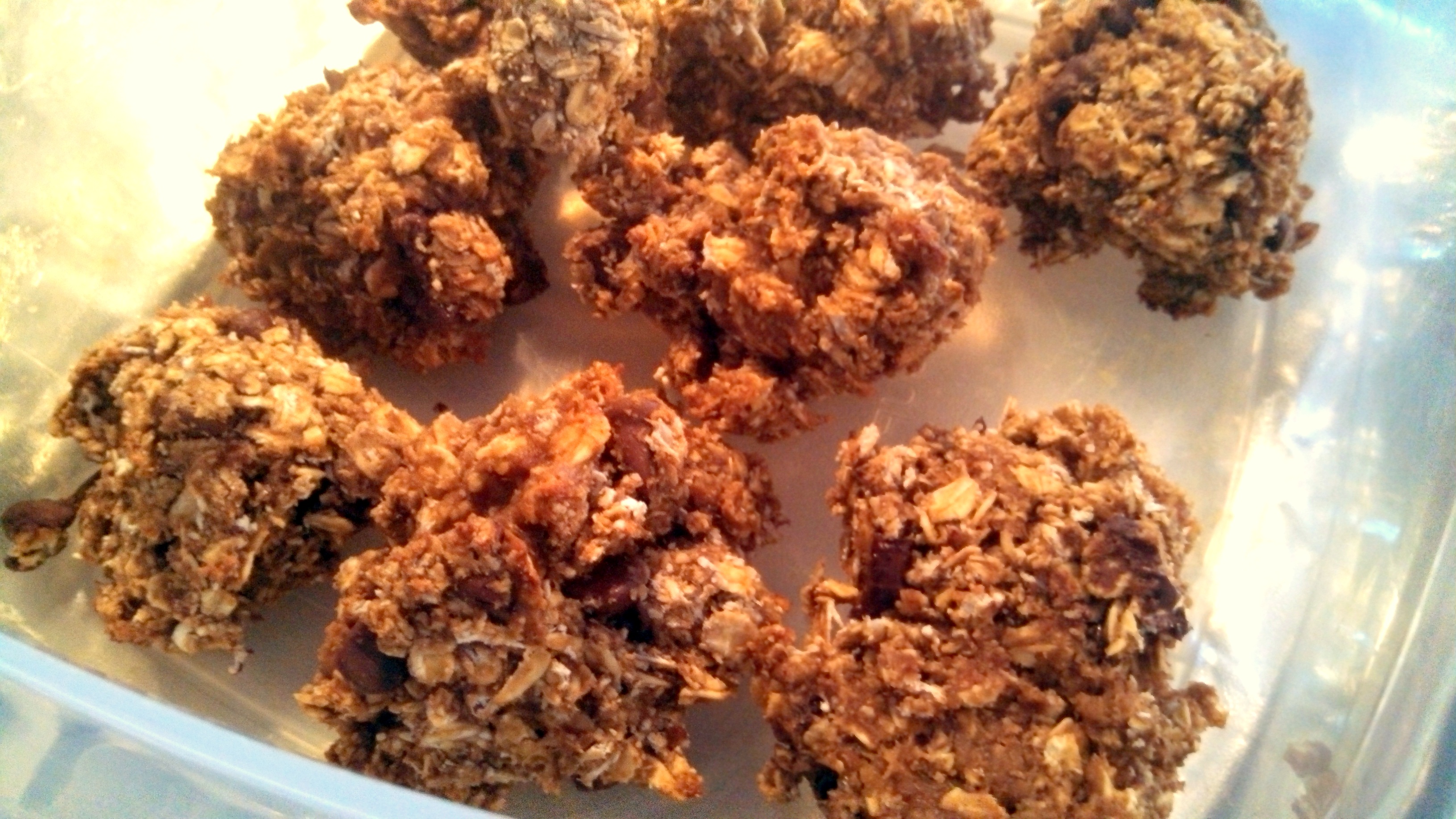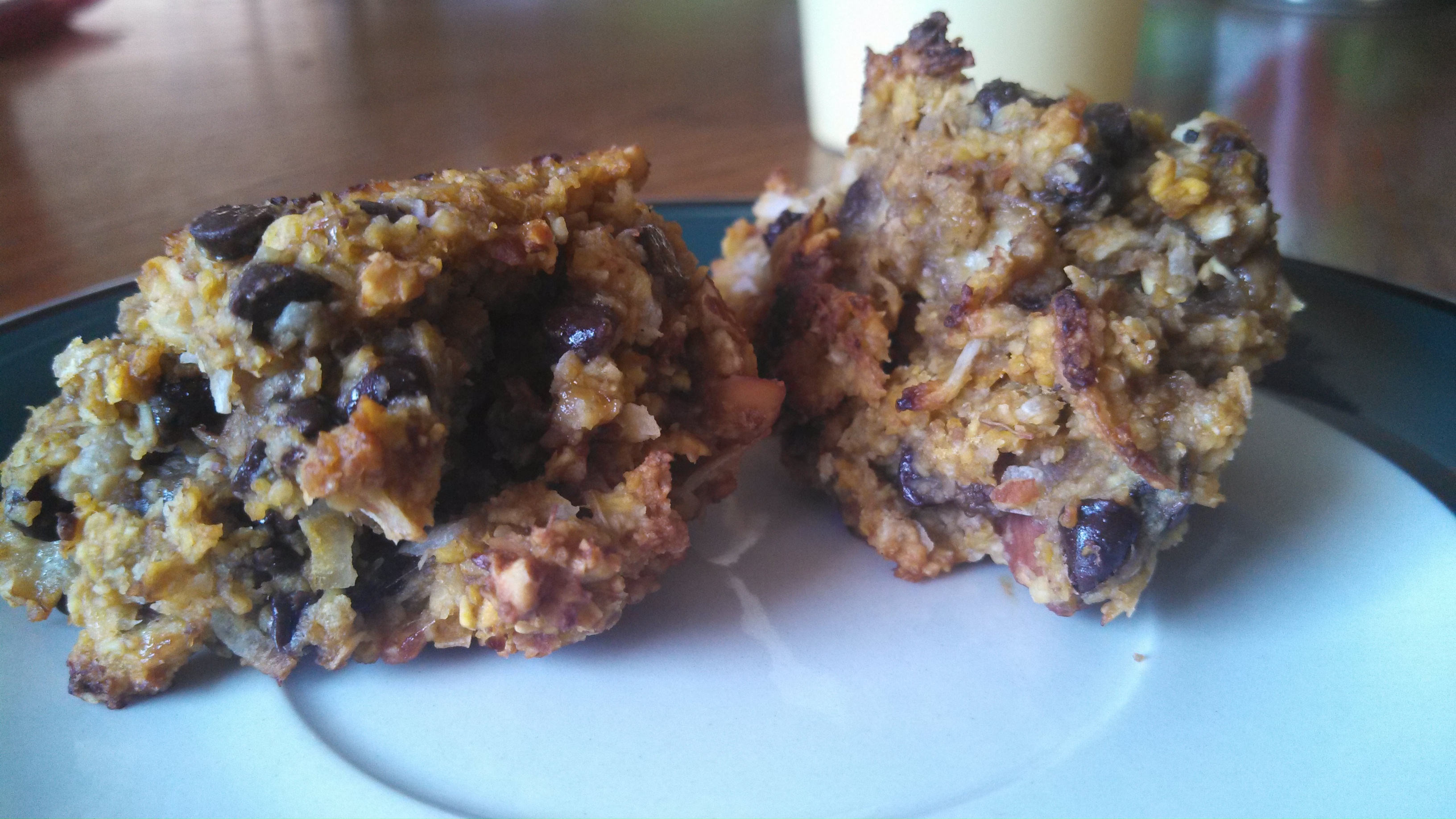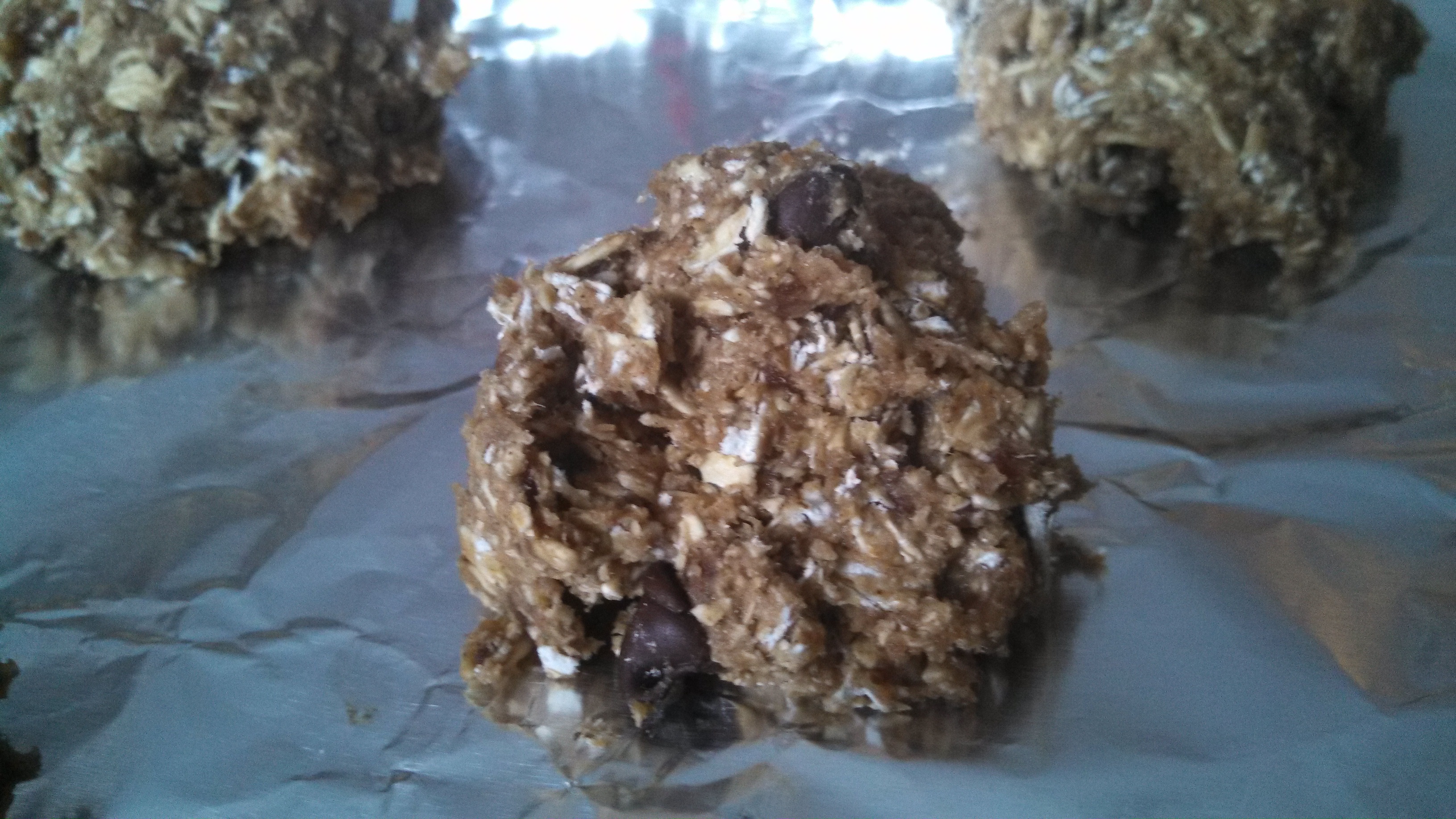 Mix in chocolate chips and additional 1/2 c oats. Scoop into 1.5-2 inch mounds on parchment or foil-lined baking sheet and bake about 17 minutes @ 350-degrees, or until golden brown on bottom.