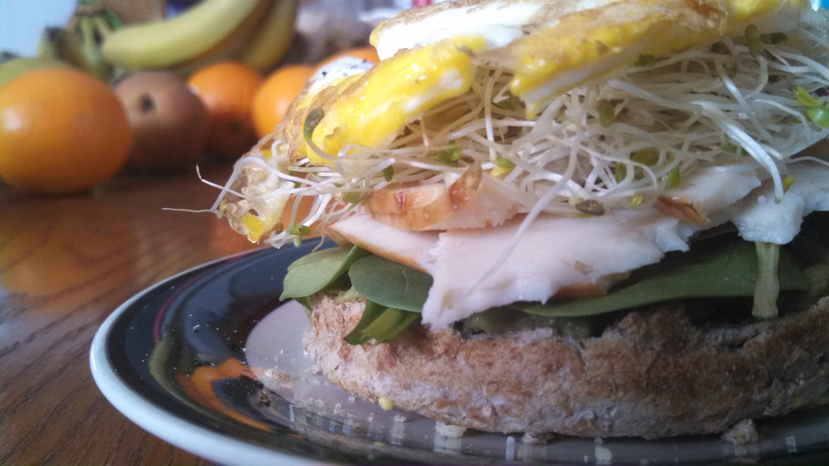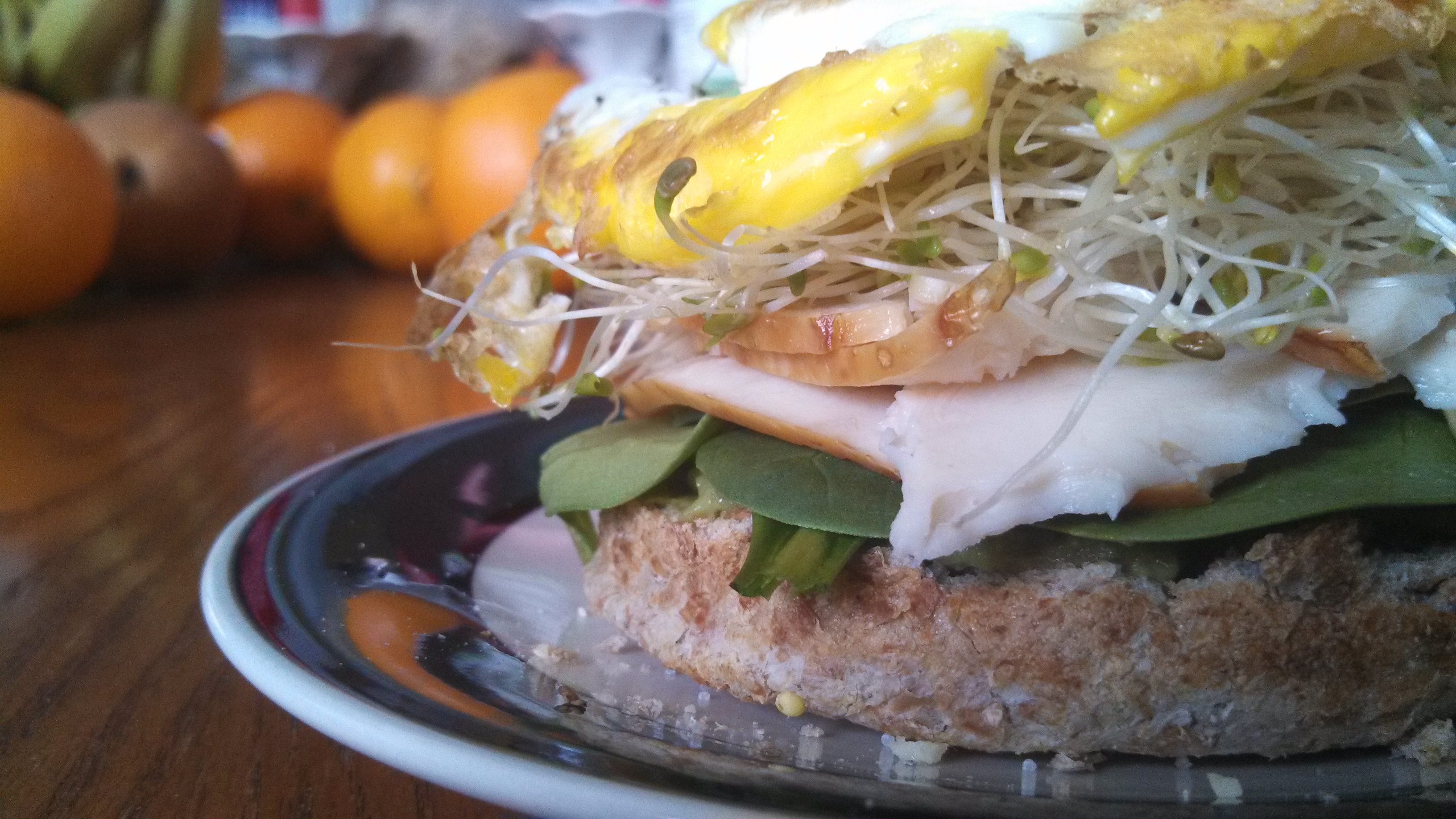 While toasting the English muffin, prepare the avocado spread by mashing in the chopped onion, garlic salt, and pepper into avocado with fork. Spread onto muffin. Layer spinach, sprouts, turkey, and egg. Top off with salt and pepper to desired taste.