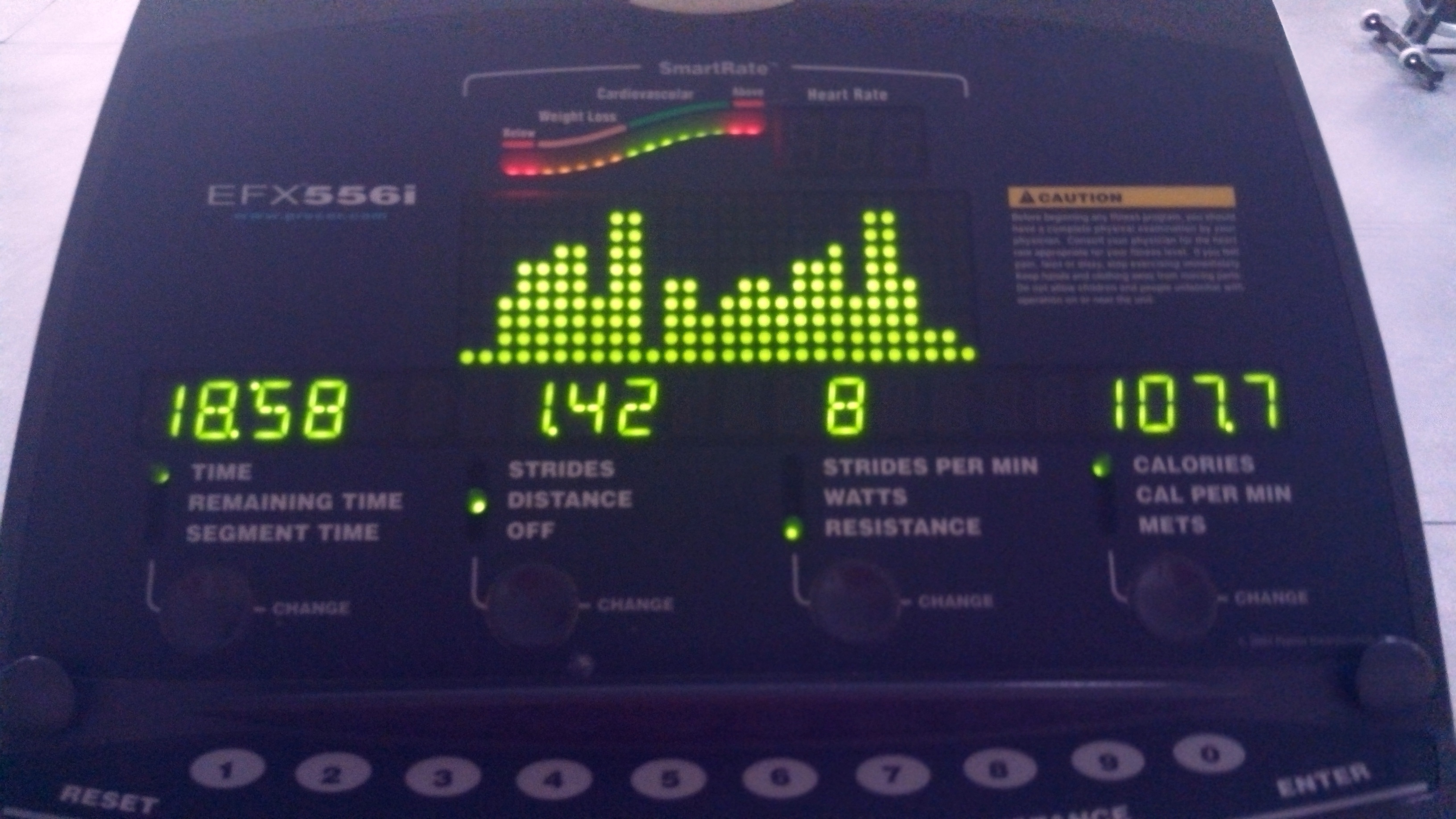 I’m actually sore from yesterday’s workout, (that’s what happens when you don’t stretch properly), so I opted for 40 minutes of cardio instead.  I did the same workout as last time I was on the elliptical, which was the “cardio interval” program.  I learned today that you can increase the resistance of the overall program by pushing the up arrow for resistance once you’ve selected the program you want.  Wow!  This is great because I get bored with workouts easily, and even though I repeat some of the same pre-programmed workouts, I can steadily increase the difficulty.  Bam.